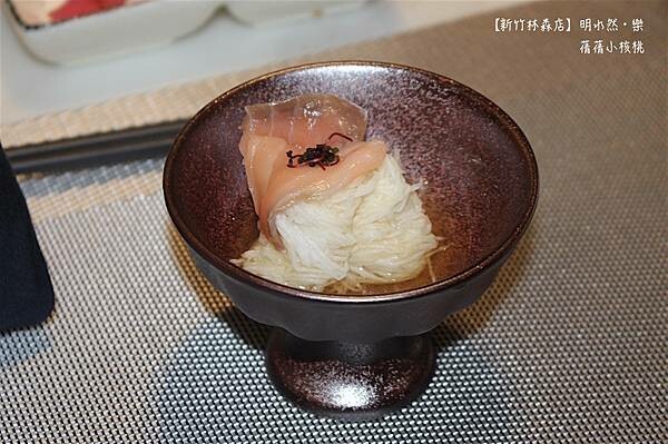 乍看之下,艾琳也以為這道是冷燻鮭魚麵線,原來這道開胃菜是師傅的創意料理-冷燻鮭魚山藥細粉,聽師傅說:這是❮明水然•樂❯的堅持,每一道餐點都必須歷經3個月以上,不斷的測試、研發和創新,才會正式推出。