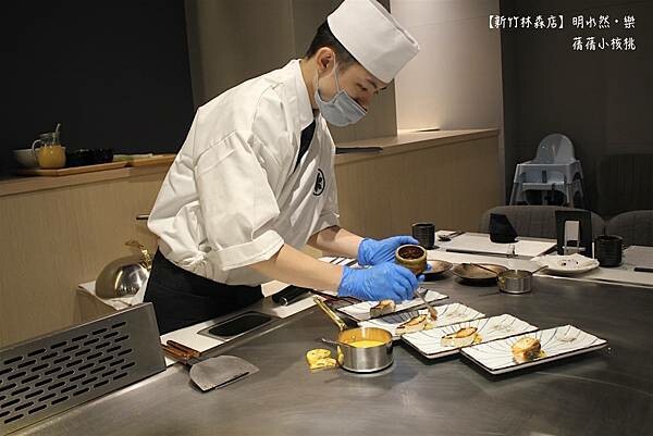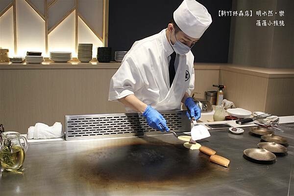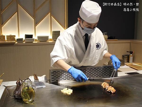 此時服務艾琳和朋友的鐵板燒師傅:由於明水然•樂是Omakase,也就是日本料理裡的無菜單料理,我們會依照不同的季節,選用當季時令現流魚每日產地新鮮直送,我們家品牌的師傅也會出海海釣,常常有機會吃得到海釣到的新鮮活魚!