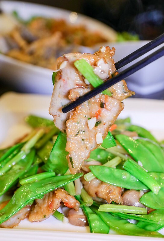荷芹炒魚鬆,這菜有意思,看起來像甜不辣的,其實是粵菜、港澳常見的鯪魚拆肉剁泥混入香菜馬蹄,滾成圓球,再入鍋慢煎炸成魚餅,起鍋切片,和荷蘭豆芹梗炒香,味道很像兒時常吃的芹菜炒甜不辣..魚鬆軟綿鮮甜,微脆伴隨著蒜味和鹹香氣息和爽脆的四季豆、芹菜呼應,看似簡單卻是道頗費工的家常。