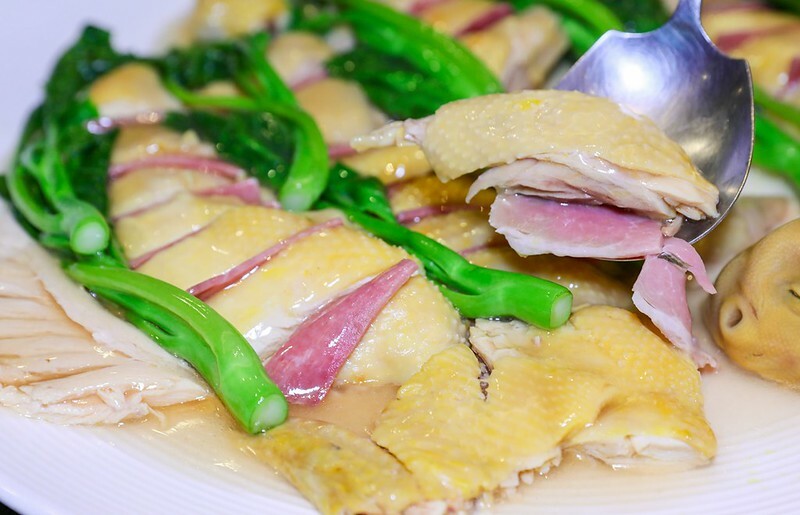 據說金華玉樹雞(需三天前先預約),源起於三、四十年代廣州的聚豐園,為給牙口不好的長輩方便食用,改白斬雞去骨泡浸,讓肉滑嫩易食,而做出了金華玉樹雞,被譽為廣州宴席四大名菜。金華雞做工繁複,鳳眼水泡熟,冰鎮、拆骨拔肉,再切成完美的二十四塊,溫泡⋯,幾乎跟老白說的一模一樣。金華指的自然是金華火腿,芥蘭或蘆筍翠綠代表玉樹的菜薹,也有著解膩爽口之功用。