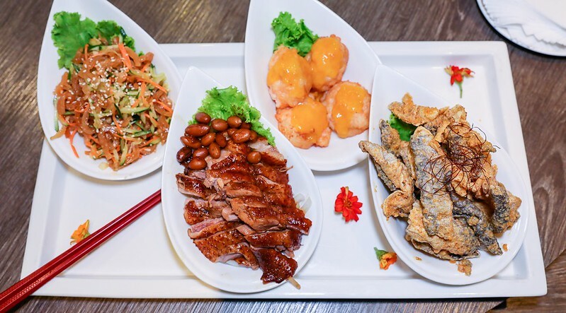 四彩拼盤(百花煎釀帶子皇、滷水鵝、金沙魚皮、醋溜海蜇),更多菜單。