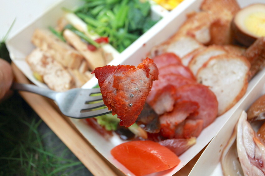 這綜合飯裡面主菜有油雞、叉燒、香腸、肝腸、臘腸及肉卷等。