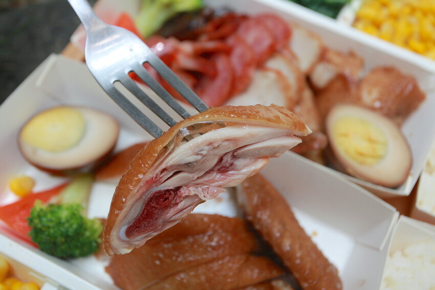 檯面上有放置一些油雞、鹹水雞、香腸、臘腸及肉捲等主菜,供顧客挑選及公園供搭配便當。