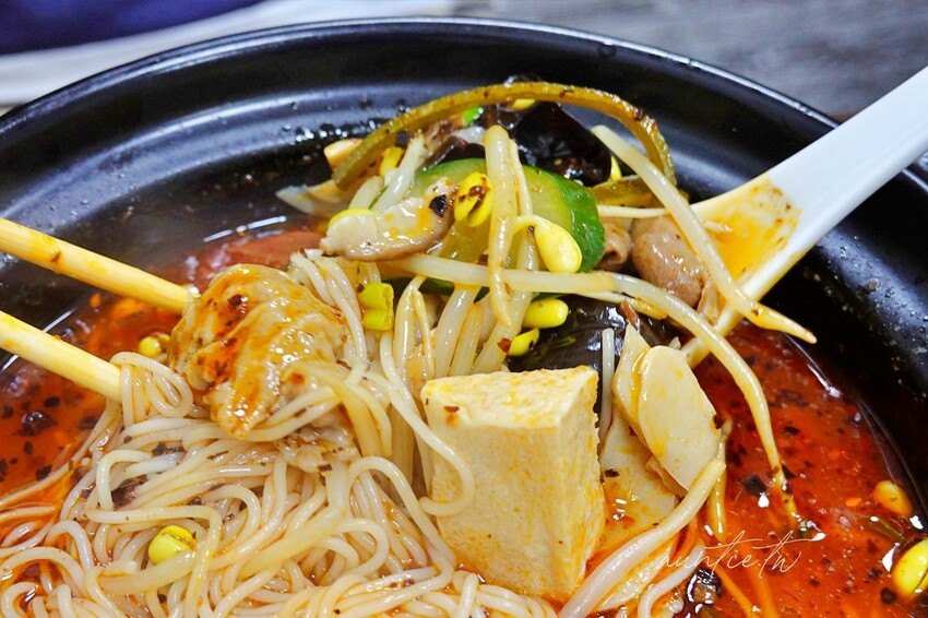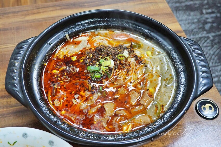 麻辣肥腸砂鍋米線,老闆娘說湯頭是以雞骨熬煮的,點了中辣,但是吃起來感覺比重慶小麵的小辣還不辣,湯頭也是可以喝的,雖然有一層辣椒油,但是口感是清爽的,頗厲害。配料也非常豐富,肥腸、海帶、肉羹、黃豆芽,重口味但是不會鹹,可能是個人偏好細麵的關係,個人比較愛這肥腸砂鍋。