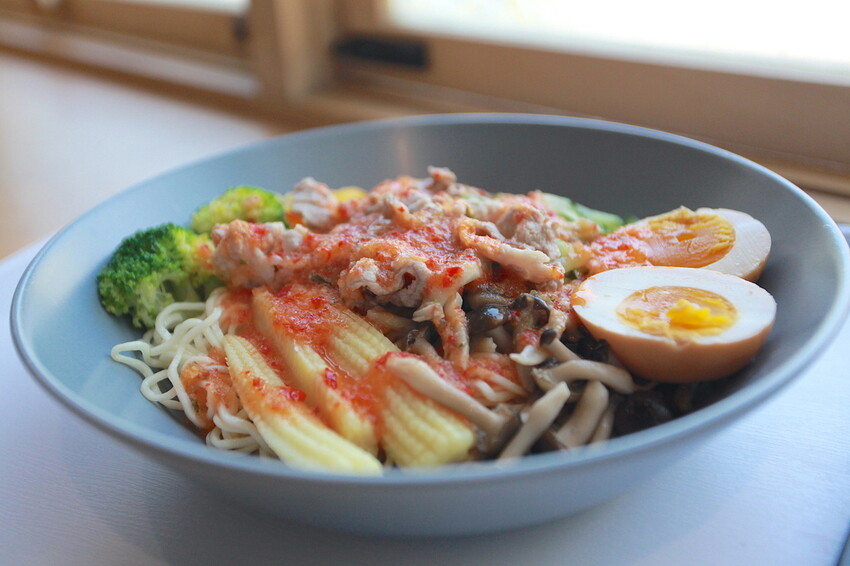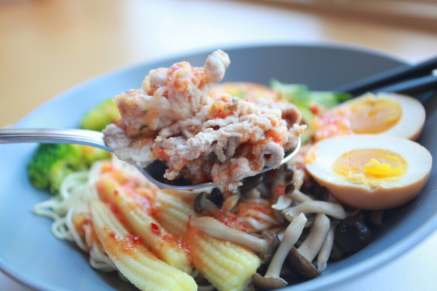 小高選擇五花牛肉涼麵選擇泰式酸辣醬100元(加麵),還額外選溏心蛋20元來增加風味。