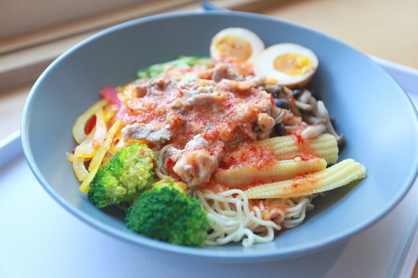 這涼麵裡面有五花牛肉、綠花椰菜、黃椒、紅椒、玉米筍、小黃瓜絲及柳松菇等食材,表面淋上粉紅色泰式酸辣醬。