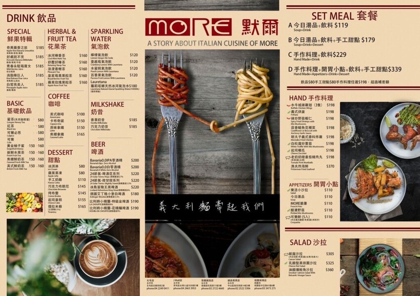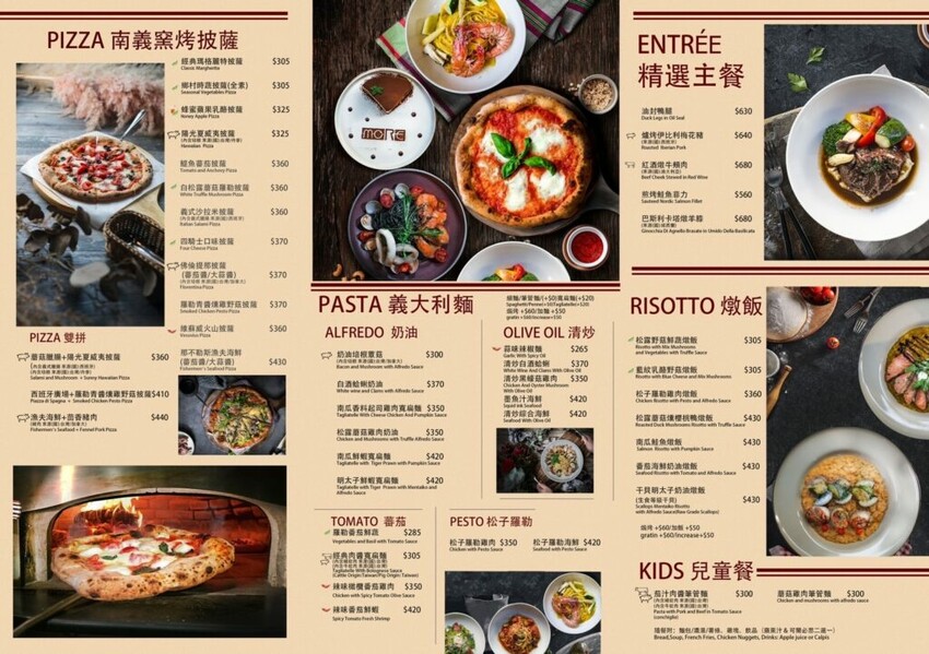 【默爾 pasta pizza】以經典的義式料理為主打,供應手工窯烤比薩、義大利麵、燉飯等主餐,還有有開胃小點、手工蛋糕和飲料品項,價位大約落在200-300元間,也有豐富的套餐系列可做升級~