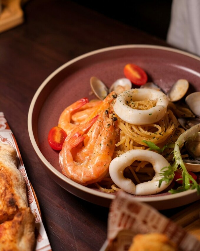 ▼清炒綜合海鮮使用頂級橄欖油與香蒜爆炒,吃得到蝦子、透抽及蛤蜊等食材,調味恰好,能感受到海鮮本身的鮮甜,麵條吃起來Q彈帶點硬度,伴隨迷人的蒜香相當涮嘴~