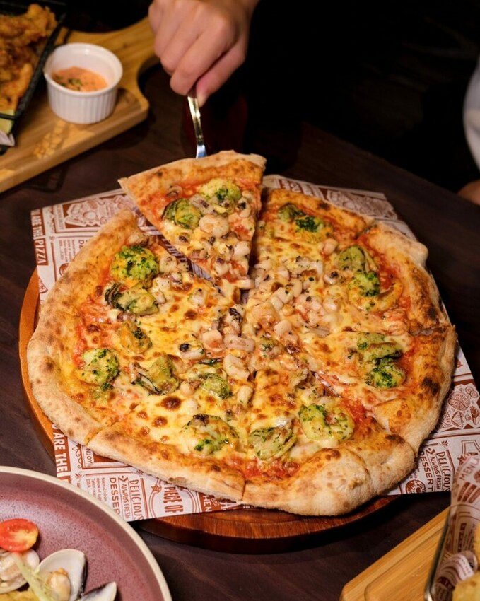 ▼那不勒斯漁夫比薩放滿蝦仁、透抽、起司等新鮮海味,以濃郁天然的番茄醬料為基底,酸酸甜甜,豐富餡料搭配手工薄脆Q軟餅皮,好吃到連邊邊都讓人不想放過~