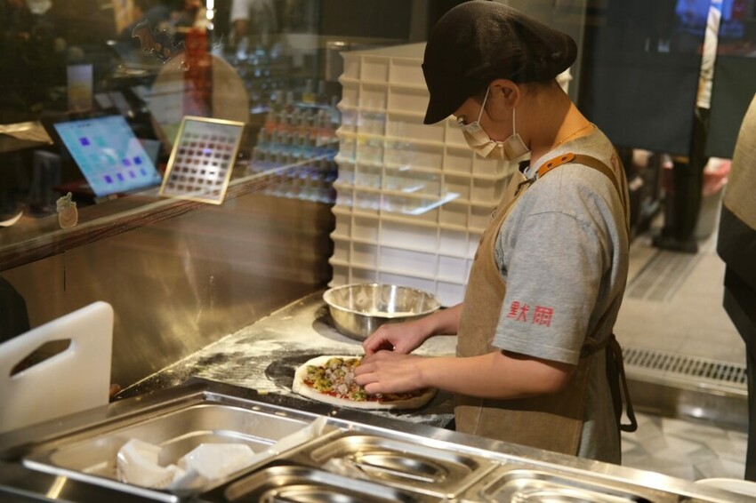 ▼【默爾 pasta pizza】採取透明式的廚房設計,可以清楚看到廚師料理餐點的過程,餐點都是從原食材手工製作,不使用半成品或冷凍醬料,招牌比薩依照南義大利的傳統做法,選用義大利進口麵粉及新鮮食材,將麵團天然發酵在手工桿製,看著滿滿餡料撒在餅皮上,再放入義式經典的窯烤爐當中。