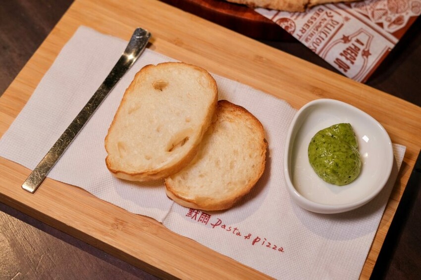 ▼點選義大利麵系列會贈送一份麵包,熱呼呼出爐吃起來酥脆好咬,沾點店家自製的青醬更有味!