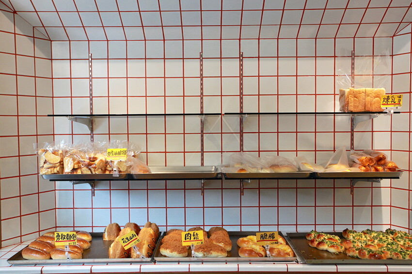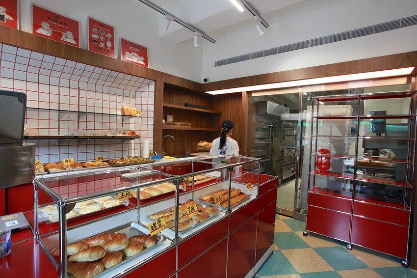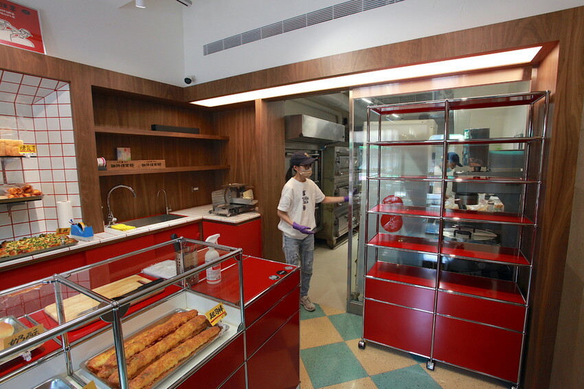 木門推開裡面空間不大是很整潔,室內放置大紅色櫃檯和櫃子,搭配白色磁磚充滿日式氣息,裡面有麵包師傅正在製作麵包。