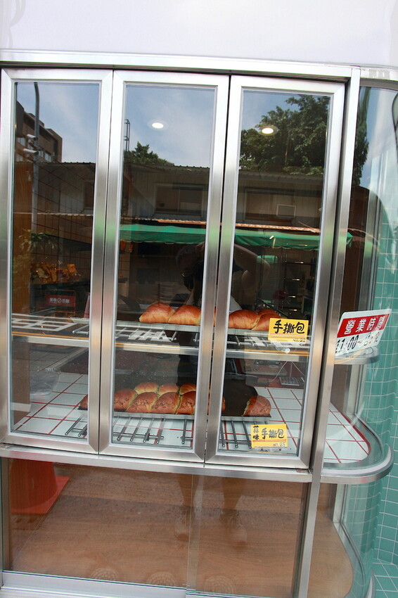 金屬色櫥窗可直視裡面麵包陳設,可看到店家招牌商品手撕麵包。