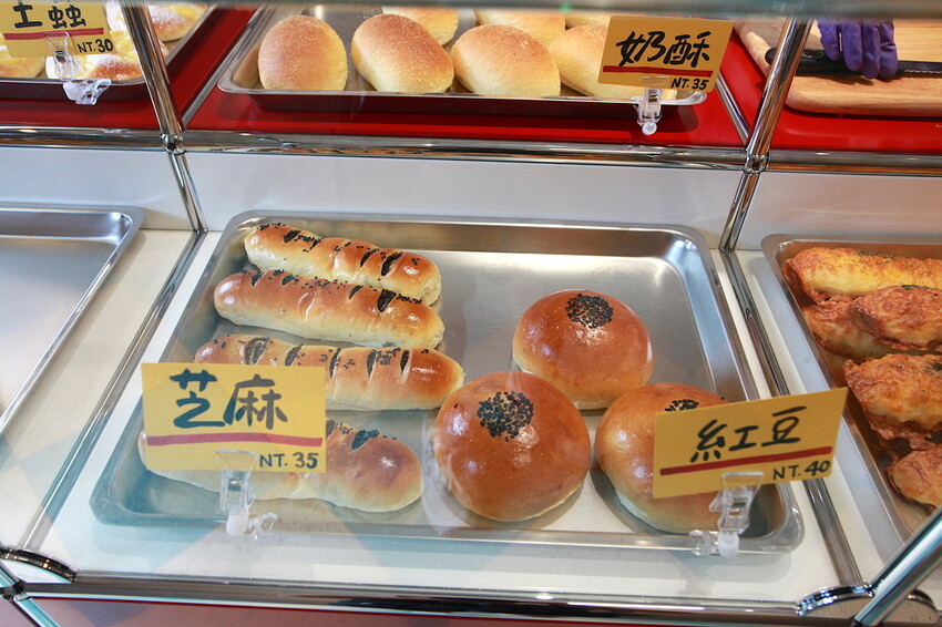 檯面上大概有10來樣麵包供選購,麵包種類有起司棒、紅豆麵包、芝麻麵包、奶酥麵包、蔥花麵包、螺絲卷麵包、肉鬆麵包、脆腸麵包、勇敢麵包、手撕麵包....等等。