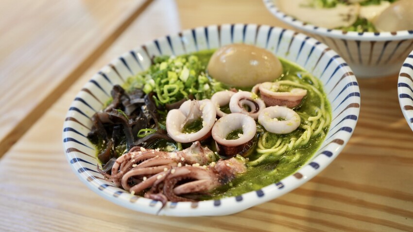 嚴選新鮮直送的澎湖中卷,不只分量足且入口Q彈鮮脆有咀嚼感,湯頭味道純粹濃郁、口感濃稠又細緻,在盛夏來一點清爽的拉麵吧!