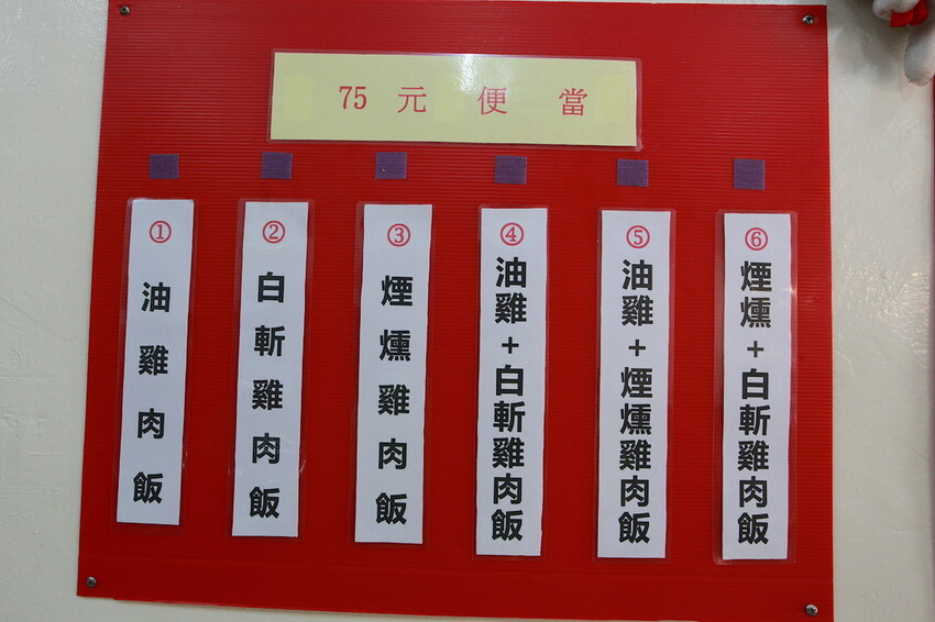這裡賣的便當有75元和90元兩種,這些便當主菜就以白斬雞、煙燻雞及油雞來搭配供應,小高就選綜合雞肉飯90元來享用。
