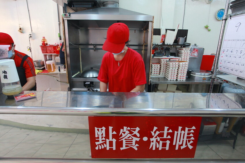 料理台上有公告依序排隊領取號碼牌,可見用餐高峰時段是大排長龍。