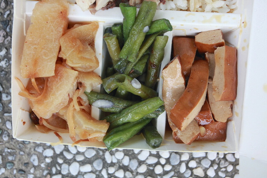 這綜合便當給的雞肉份量是很多,三種配菜外觀並不吸引我目光。