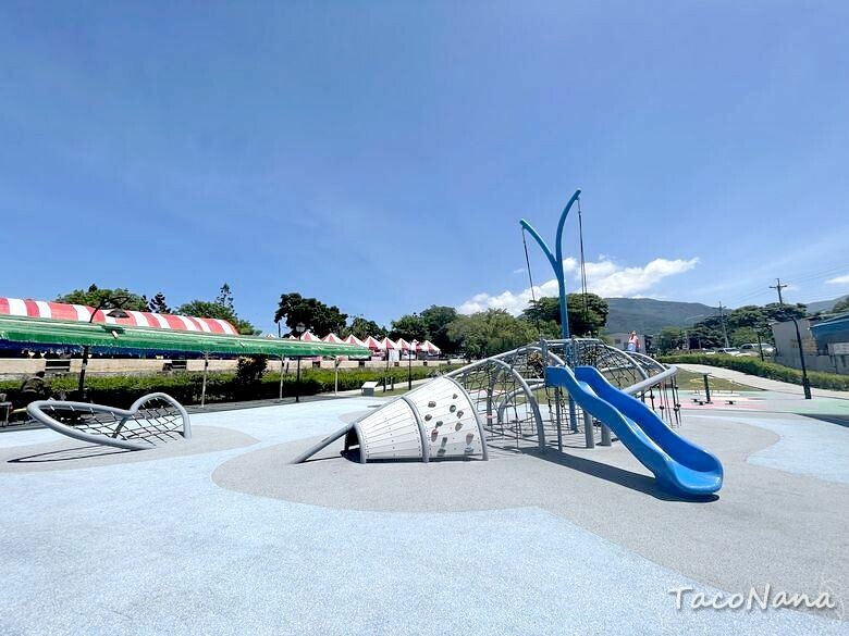 一旁的鯨魚攀爬網與溜滑梯,太陽不大的話,可以來活動一下筋骨喔!