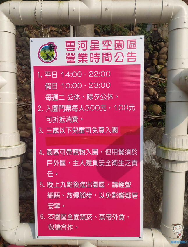 雲河星空的門票是$300/人,$100可以折抵消費,3歲以下免費入園