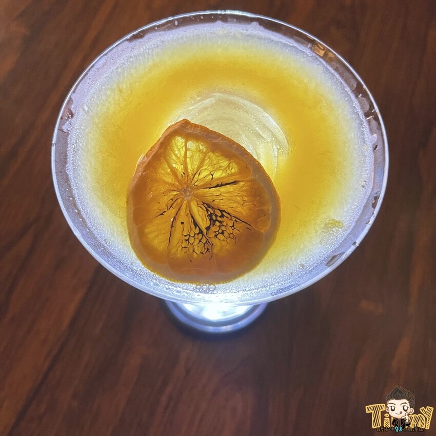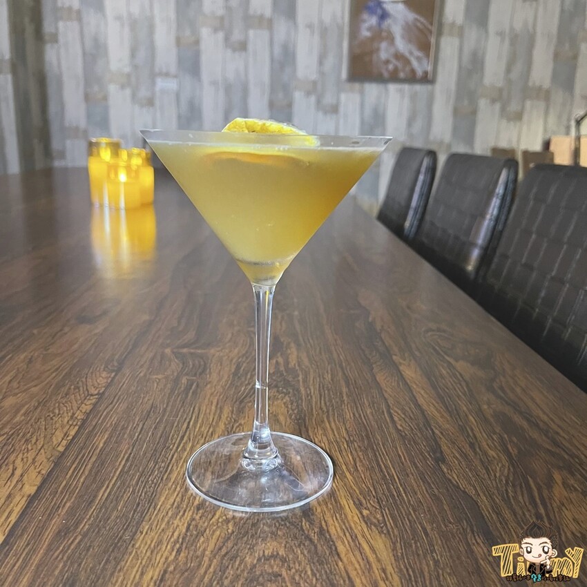 這杯酒基底有琴酒和自製的伯爵伏特加,以橙香白蘭地做冰鎮和渲染,最後加入一點點檸檬和百香果,喝起來一點點甜甜、烈烈的口感
