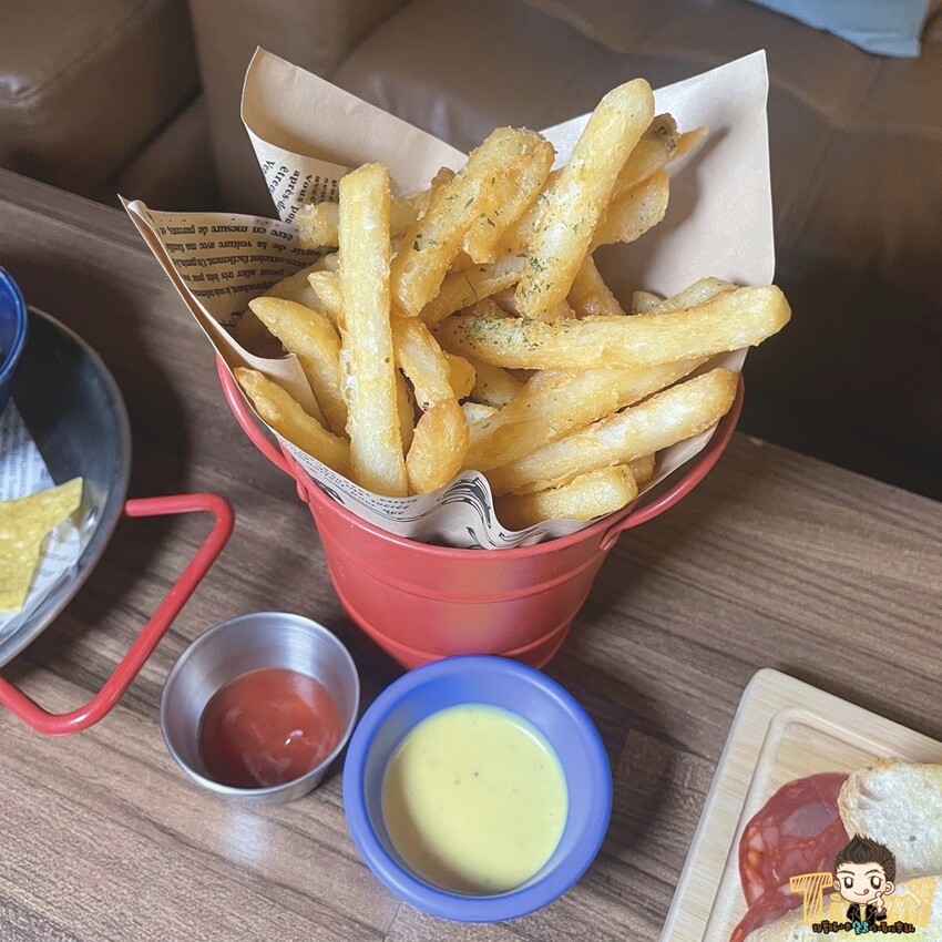 鐵桶厚切薯條 (150元),也是很好的下酒菜,有蜂蜜芥末和塔塔醬可以二選一,還會附上番茄醬。