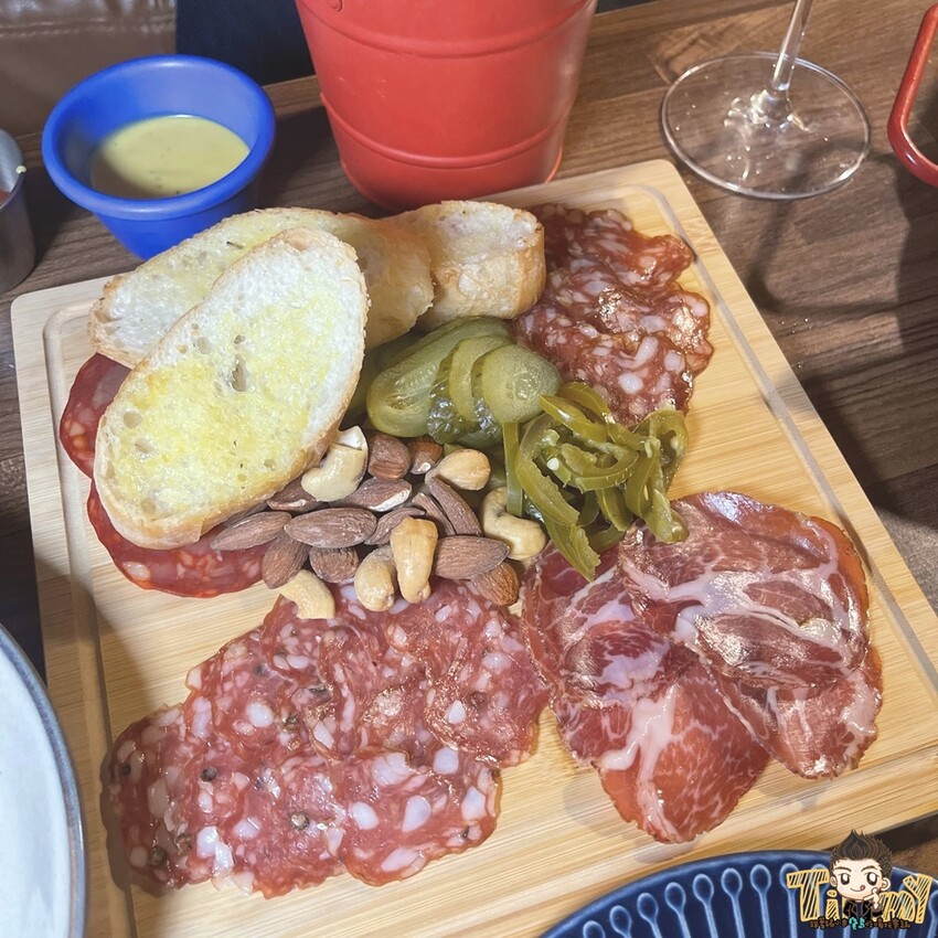 法國麵包切片 綜合SALAMI堅果 燻肉盤 (399元),有4種不同的煙燻香腸,搭配堅果、酸黃瓜、奶油法國麵包,是配酒的最佳主角