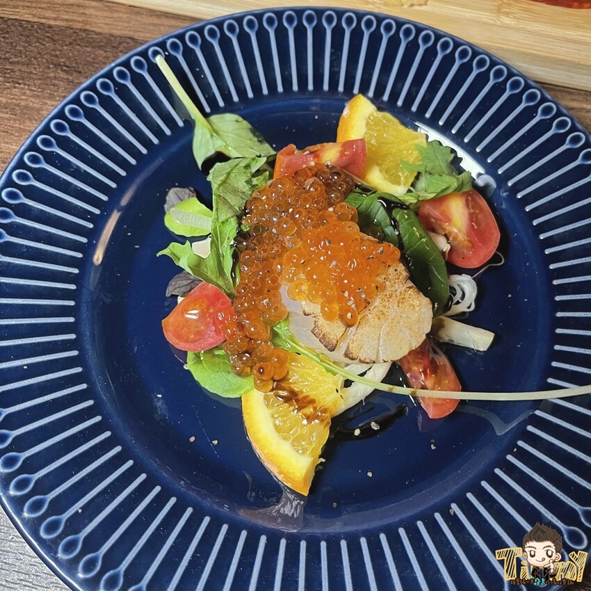 超大的生食級干貝帶有炙燒香氣,有脆度的口感,搭配鹹香鮮甜的鮭魚卵,一口吃還有嘴爆的口感,超過癮的!