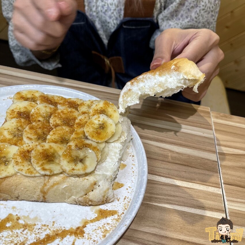 很有文青感的琥珀花蕉山吐司(90元),在厚片山形吐司上塗上一層酸V乳酪,鋪上香蕉切片後,加上焦糖醬和花生粉炙燒。