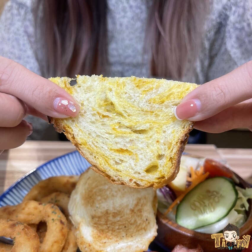 這一片比較特別的是店家跟竹北在地養蜂園訂製的花粉蜂蜜麵包,挺不錯吃的
