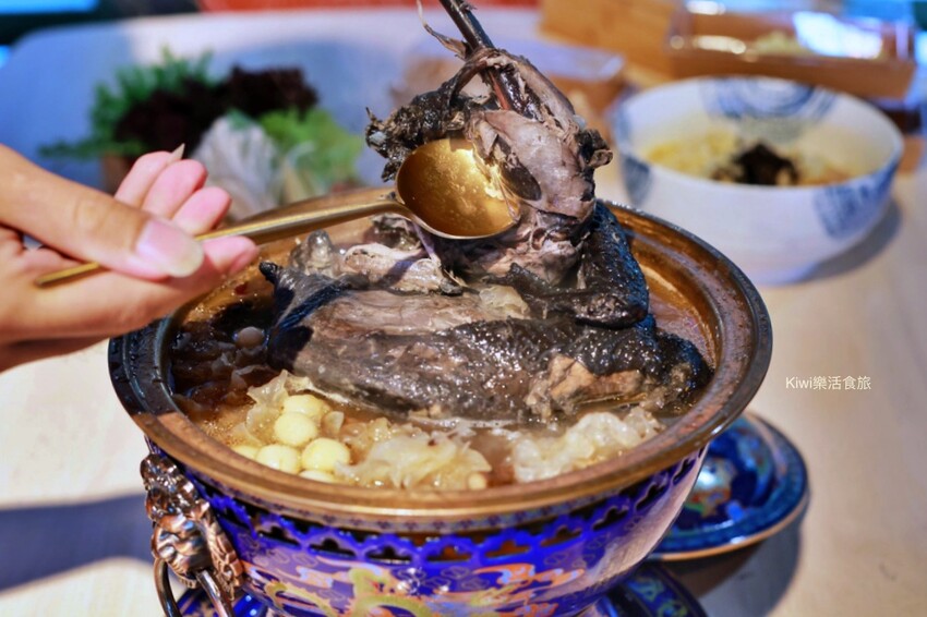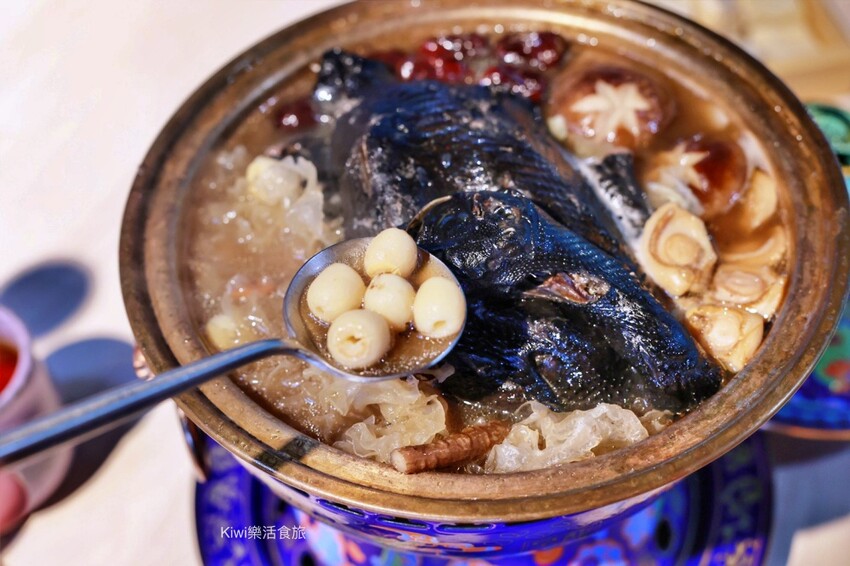 真的一點也不誇張,黑美人鮑魚雞鍋送上時,我們驚訝連連!這整隻烏骨雞就在景泰藍復古網美火鍋中,裡頭配料更是會讓你讚不絕口,甘甜的湯底,搭配鮑魚、香菇、紅棗、銀耳、蓮子,底下還有高麗菜~整個滾起來那飄香四溢,哎呀!要瘋掉了~
