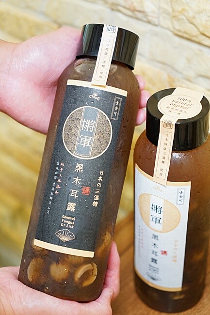 㯍軍黑木耳露,聽闆娘說因為老闆之前是某將軍的御廚,當時熬煮這黑木耳露深得將軍的喜歡,故取名為㯍軍。而且這黑木耳露特選Costco內也有在販售的彥廷農場家的黑木耳來熬煮,並以台灣柴燒桂圓來增添木耳露的口感,再以日本三溫糖取代一般蔗糖的甜膩,精心熬煮8小時將黑木耳得膠質都完全的釋放出來,所以當你在喝時會深深感覺到比一般市售的黑木耳露較濃稠卻又不甜膩唷!