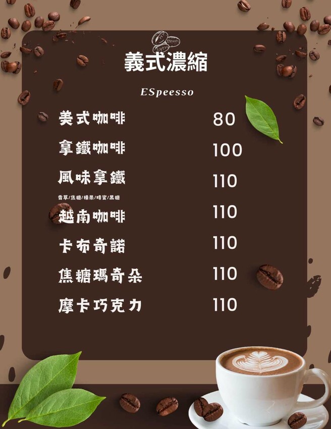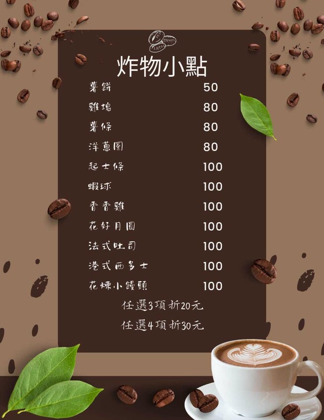 主要販售以咖啡、古巴三明治、炸物小點、手做甜點、茶飲與鮮奶茶,剛剛有說道可以小酌一下,在無咖啡因的頁面有國寶茶、咖啡奶酒和熱紅酒