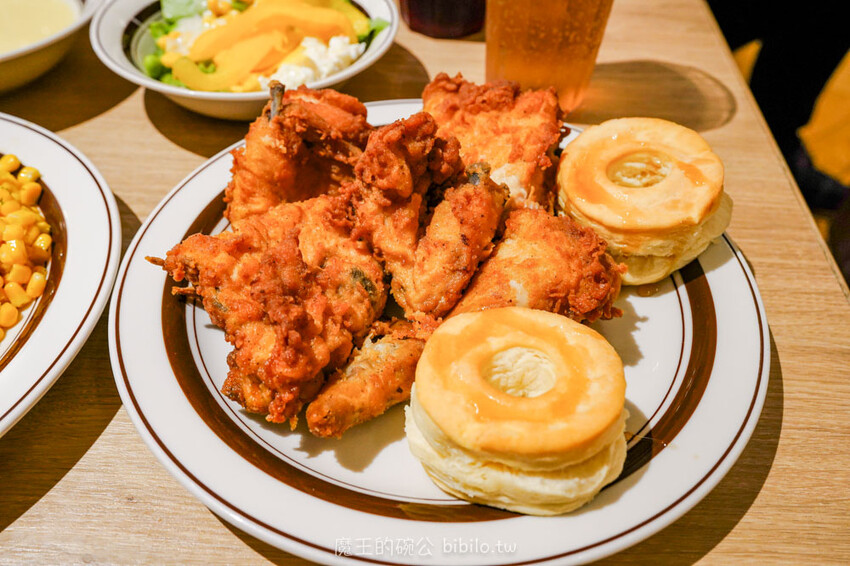 滿心期待炸雞,不過我必須說,旁邊的比斯吉跟雞柳條才是我最愛,日本沒有卡啦脆雞,只有薄皮嫩雞,所以我不是很喜歡,就算是台灣的薄皮嫩雞,我也不愛,雖然炸雞味道真的新鮮又帶有甜味,但雞皮爛爛的,很影響口感,我吃沒幾塊就轉戰其他餐點了,不過大家一定要來吃日本肯德基的比斯吉,天殺的美味!外層酥脆但內層卻鬆軟不乾,不卡喉嚨,我超級推薦大家一定要拿比斯吉,另外比斯吉有蜂蜜,果醬,鮮奶油等可以沾來吃,增添不同口感,這一顆比斯吉,我私心覺得比炸雞還要好吃太多,哈哈哈哈哈!
