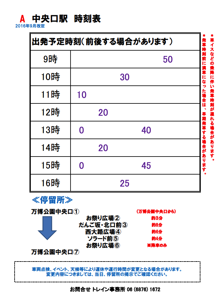 時刻表:https://www.expo70-park.jp/sys/wp-content/uploads/train_time_201609.pdf