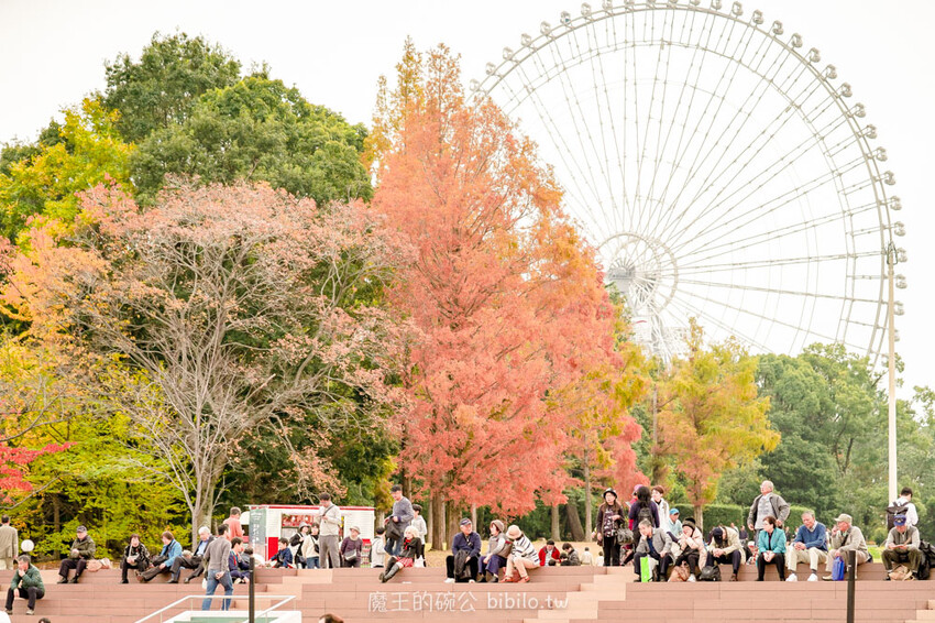 大阪萬博紀念公園在車站對面,中間隔著單軌電車還有馬路,所以要走空橋通過,前往時是賞楓季,空橋設置了出入口方向,大家依序跟著前進就好,一路上看見許多家庭都帶著野餐籃前往,邊也餐邊欣賞秋葉,實在很棒,而萬博紀念公園佔地足足有65座甲子園大,處處皆美景,一年四季栽種各種花卉,不用說觀光客愛來,連在地日本人都很喜歡。