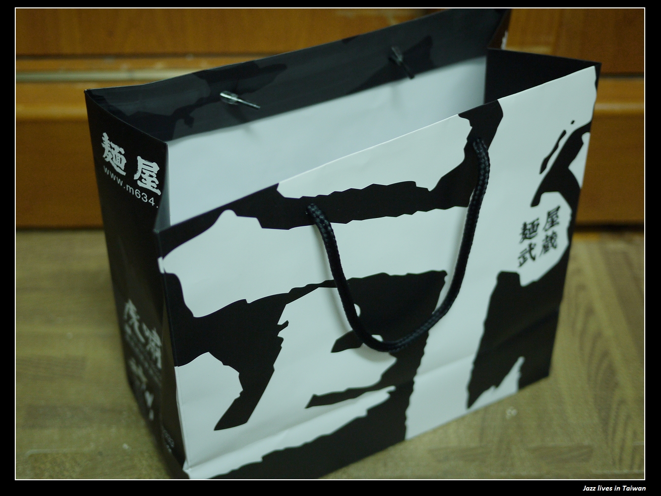 麵屋武藏紙袋還蠻好看的, 黑白風格, 打包用的塑膠盒看起來也不便宜, 只是真的會在拉麵店裡打包的客人應該不多吧!