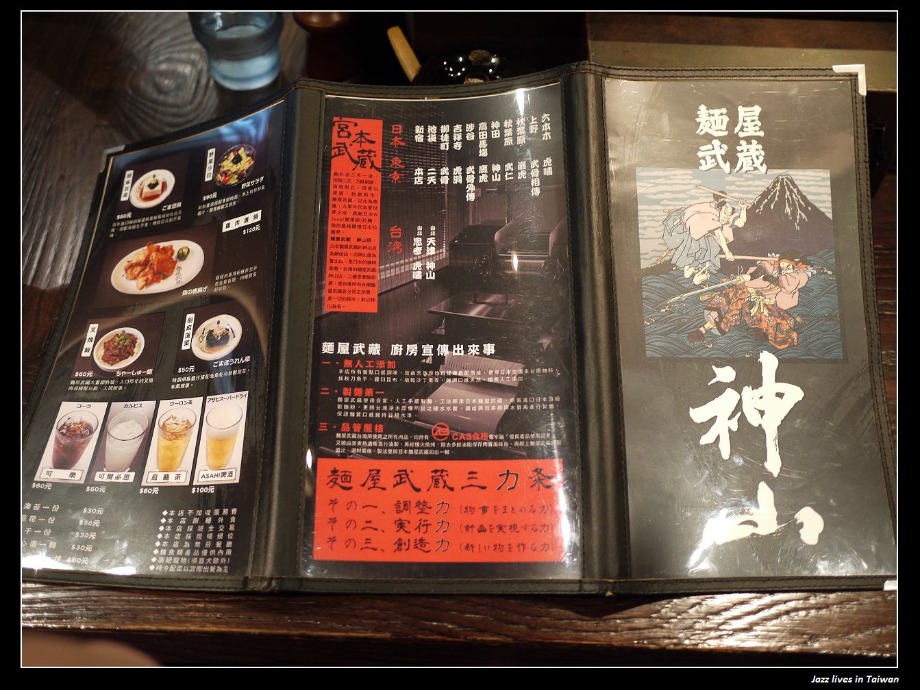 與虎嘯不同的菜單封面, 虎嘯是放浮世繪風格的老虎圖, 而神山則是佐佐木與武藏的交鋒圖(自己猜的),