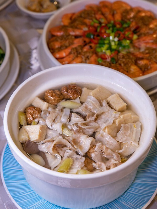 蝦哈拉麵食與白蝦的蒜蓉蒸:蒜蓉粉絲同樣少見於台灣料理的桌上,或熱炒、或台菜、辦桌菜,蒜蓉和蝦就是對味,但這道料理最美味的永遠是吸滿蝦的鮮甜、蒜蓉鹹香的粉絲,眷村客家人則喜歡用更有口感、咬勁的板條取代。