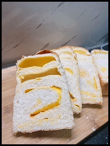 而是特別搞剛的把濃郁起司片融在麵糰裡面