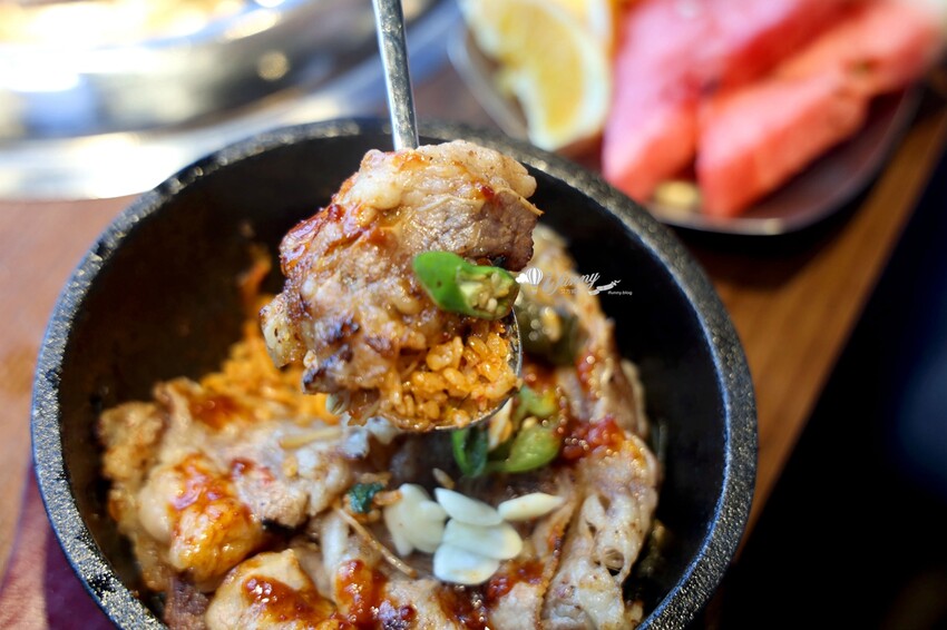 我們追加的豬五花肉,放在石鍋拌飯上,自行加工成豬肉丼飯,其上加上蒜片、糥米椒,再淋上辣味沾醬。