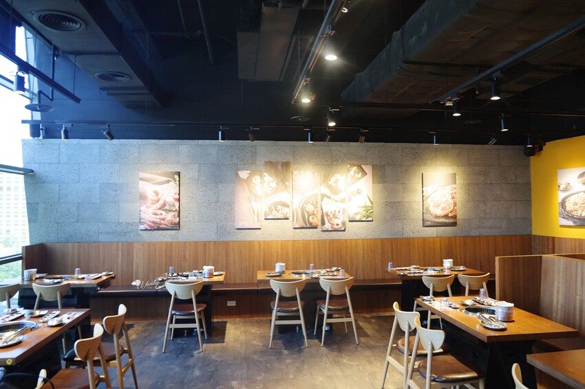 裝潢以黃黑對比配色,搭配木質桌椅,店內呈現活力十足的氛圍。