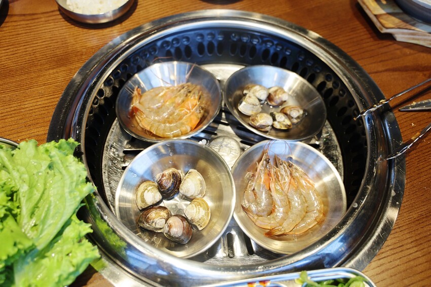 若不想吃太多肉,還有蝦子及蛤蜊可以選。直接以碗下烤盤烤,當蛤蜊在眼前迸開殼的時候,真的覺得好療癒!