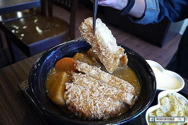 豬排是厚切的,口感紮實有彈性又不乾柴,外層的麵包粉好酥脆又不油膩,豬排有著咖哩味道,每一口都好好吃!