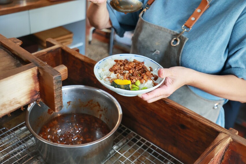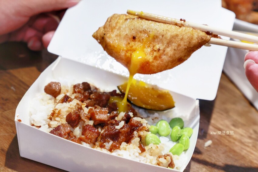 板娘說,吃魯肉飯絕對要加入這隱藏版小物,炸蛋爆漿在魯肉飯上,那真的是邪惡度破表啦!甘甜鹹香的肉汁淋在米飯上,擠破蛋黃後這金黃蛋液流出來,建議魯肉飯跟蛋液拌勻,那口感除了膠質外也更加的滑順,我好喜翻呀!