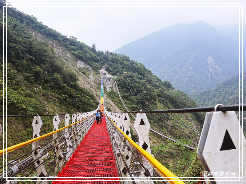 費了一番力氣終於走到了七彩吊橋😂,近看果然相當雄偉!整座吊橋共342公尺,來回走一趟約需20分鐘。橋面距谷底高度達110公尺,相當於30至40層樓高,橋面上了不同顏色,如彩虹般繽紛,難怪名曰七彩吊橋。