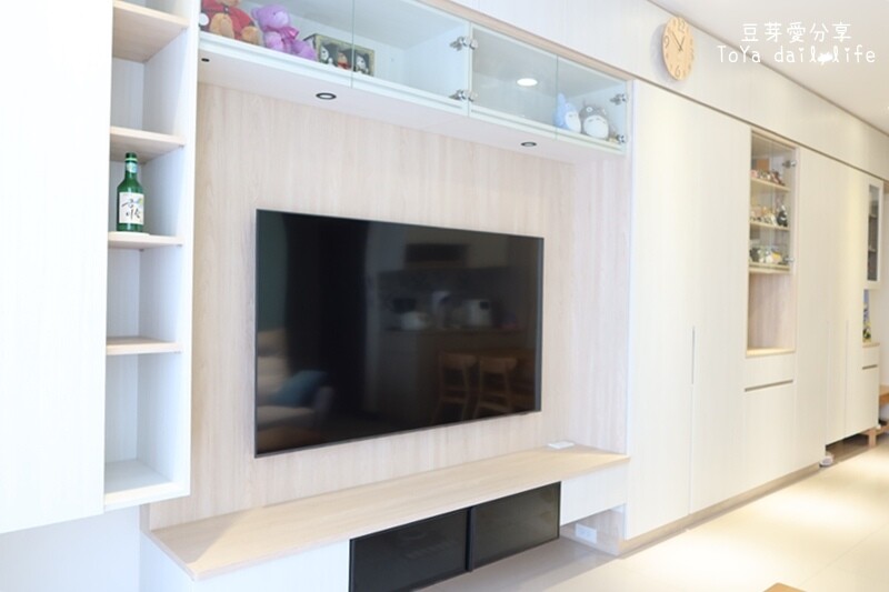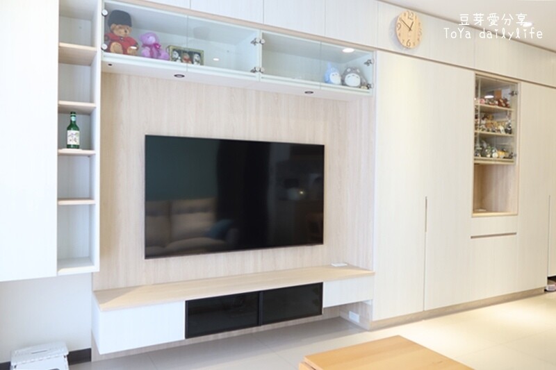 然後我們又不喜歡開放式櫃體及層板,設計師只好再幫我們增加玻璃門片,經過多次討論修改,電視牆最終變成這樣子的電視櫃。