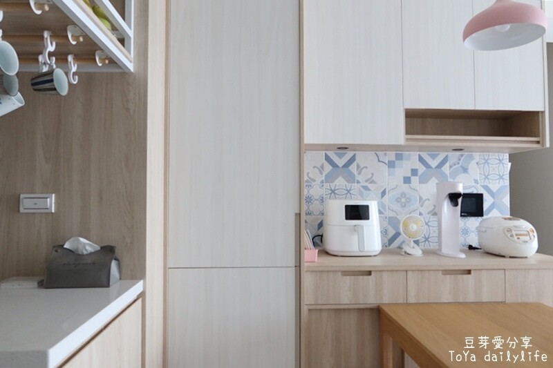 餐櫃平台上放著我們的小家電,牆面用花磚點綴,花磚是我們自己選的唷~ 貼上去還滿美的!而且單片價格不貴。