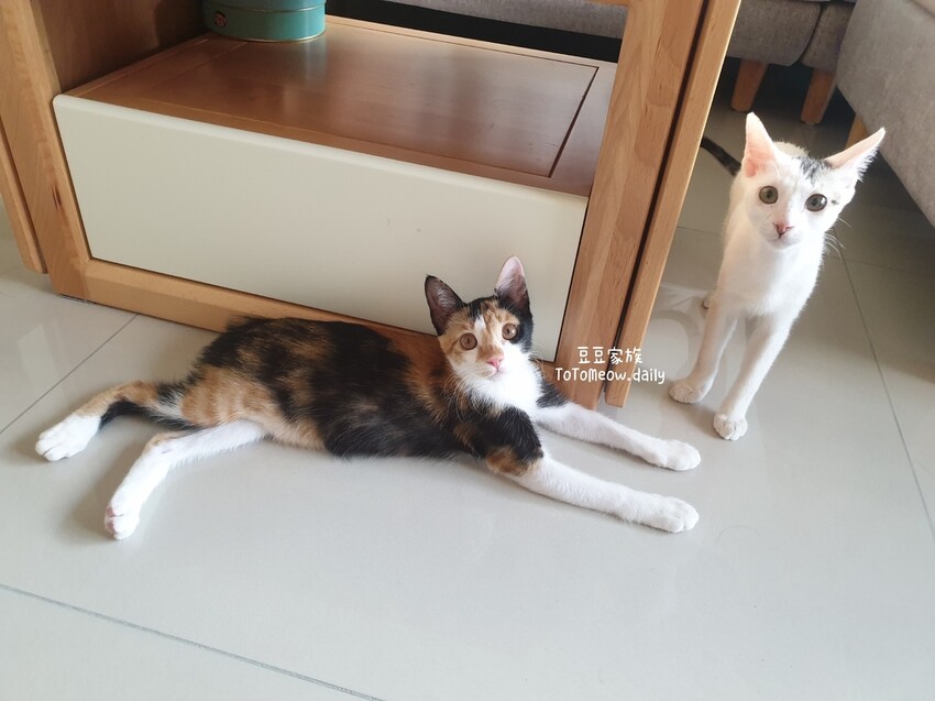 三花是女生名叫「花豆」,白底虎斑是男生名叫「麻豆」