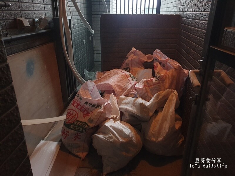 ▲打牆後打包好的廢料,整齊的放在陽台等待清運